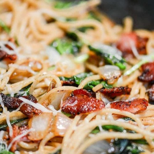 Bacon Spaghetti Florentine is a quick and easy pasta dinner made with spaghetti, bacon, spinach, onions, garlic, and Italian cheeses, including mozzarella, parmesan, and asiago, that I can have on the table in 30 minutes.