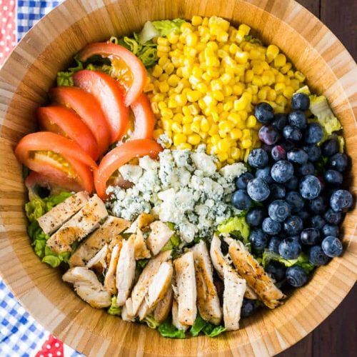 - In a large bowl, add the lettuce, corn, blueberries, tomatoes, cooked chicken, and crumbled gorgonzola cheese.