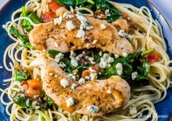 What’s for dinner Mom is the age old question asked every night in households across the world. Trying to come up with something new every night that is quick, easy, healthy, and that the family will like is always a challenge. However, this is a dinner that can meet all those needs. It includes deliciously seasoned chicken tenders with sauteed spinach in olive oil with chopped onions and minced garlic served over spaghetti and topped with chopped tomatoes and bleu cheese crumbles. Isn’t your mouth watering now waiting for this dish?