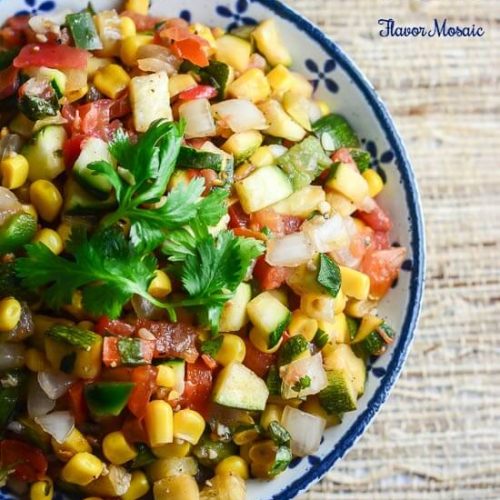 Corn and Zucchini Salsa is a perfect summer recipe to use up those tomatoes, zucchinis and corn. It is delicious on everything, especially salads, chicken, or fajita tacos.