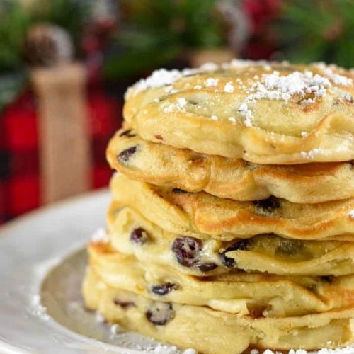 I would love to say that as a kid we had these Cranberry White Chocolate Chip Pancakes. However, my Dad did make classic pancakes that were moist and fluffy and delicious. I start with a classic fluffy pancake recipe and dress it up for the holidays with dried cranberries and white chocolate chips.
