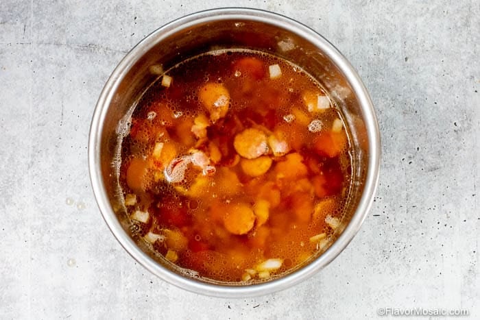 Transfer the sausage, onion, and garlic to the slow cooker, and add the rest of the ingredients in the Instant Pot and cook on low for 6 hours.