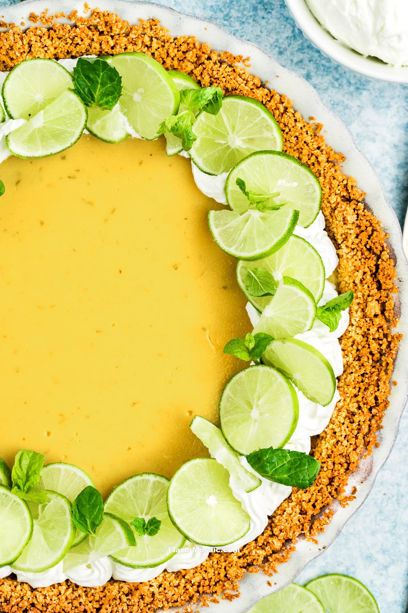 - Garnish the Pie: Pipe the whipped cream on top of the key lime pie. Garnish with extra lime slices and lime zest.