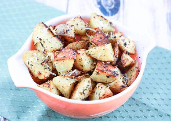 I especially like this recipe because with the oil, garlic, herbs, and parmesan cheese, the potatoes are slightly crispy on the outside soft on the inside. And the flavors of parmesan, garlic, and herbs de provence just meld together so well.