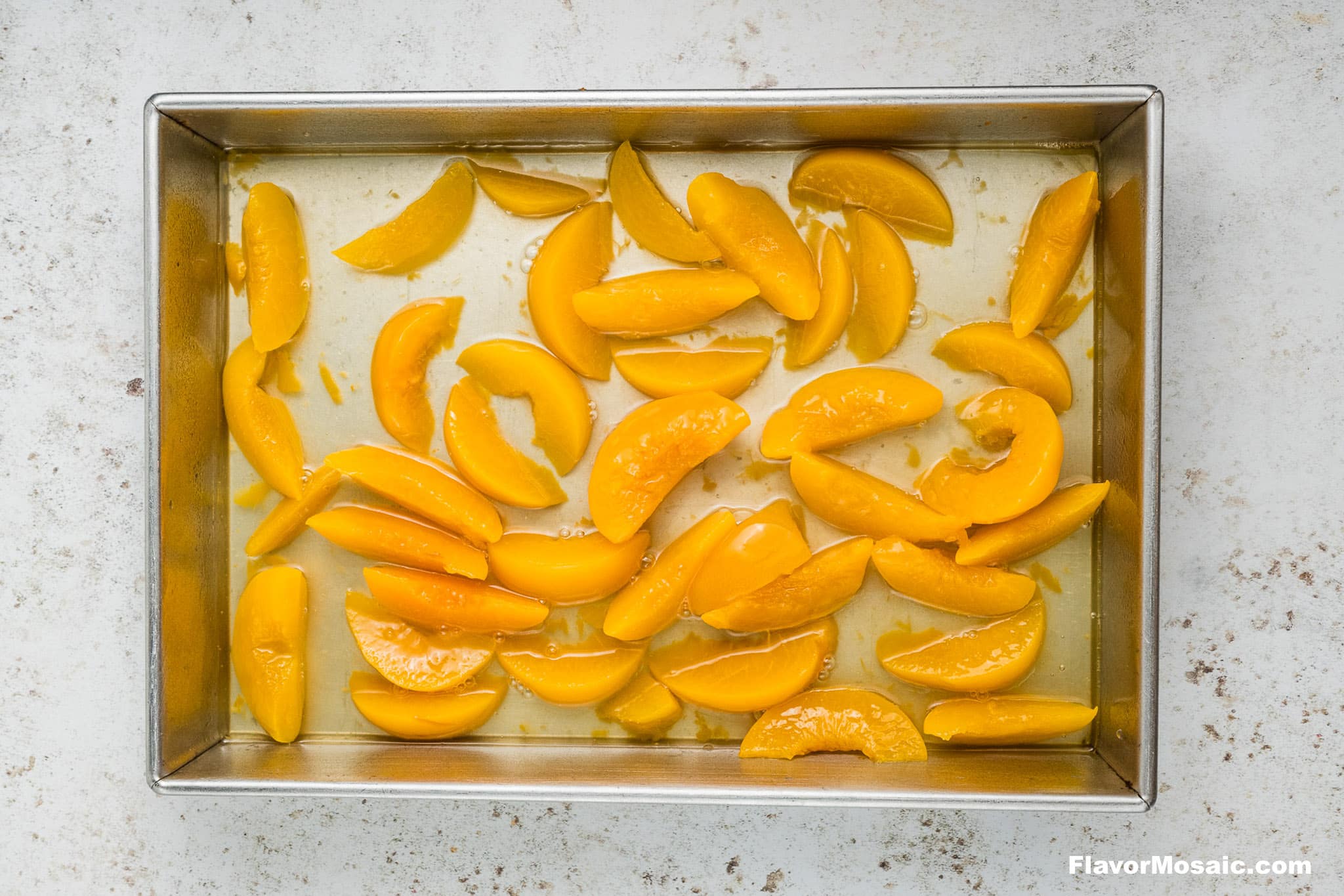 Dump the peaches (juice and all) into a greased 9×13-inch baking dish. Spread evenly.