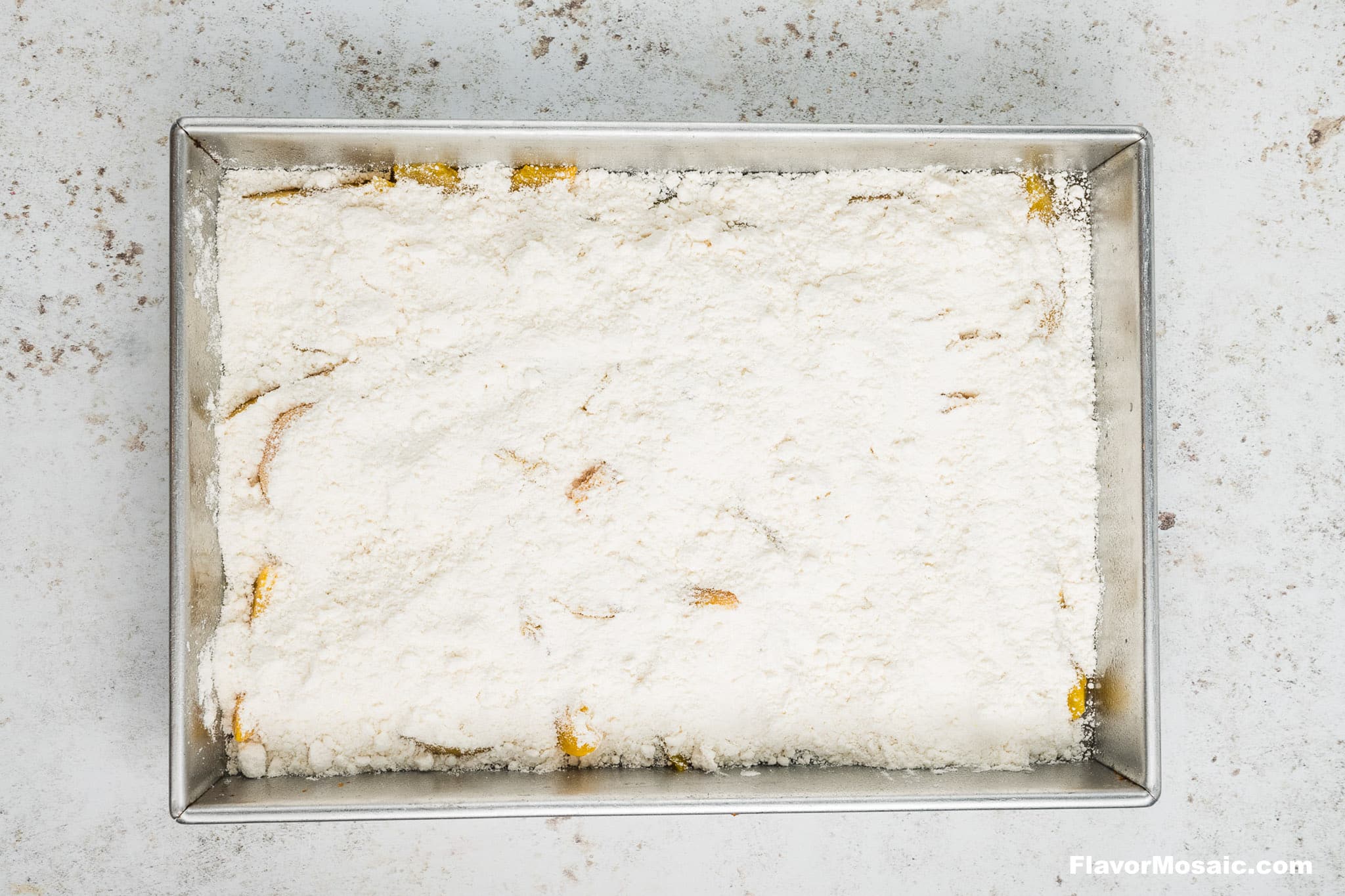 - Sprinkle entire contents of box of cake mix evenly over the peaches in the baking dish.
