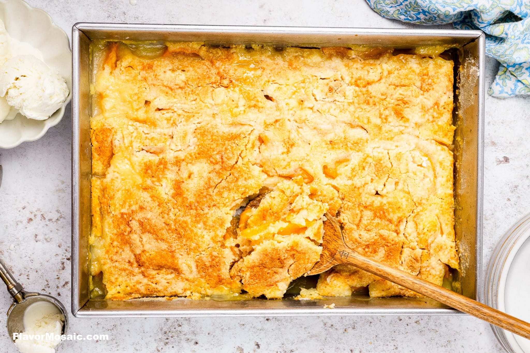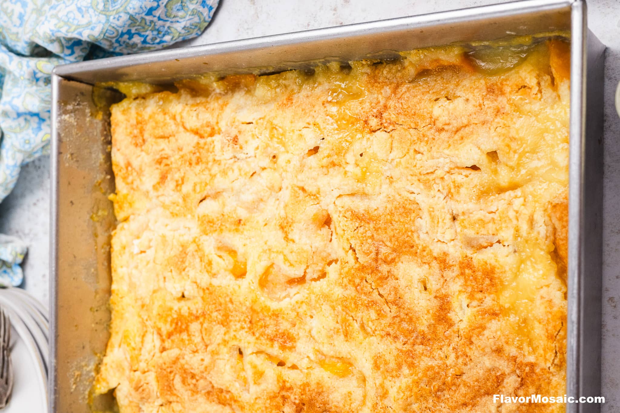 It's gooey, golden, and ridiculously easy-like "dump it all in the pan and go" easy. No bowls. No stress. No mixers. Just big peach flavor with a buttery cake topping that gets crisp and golden in the oven.