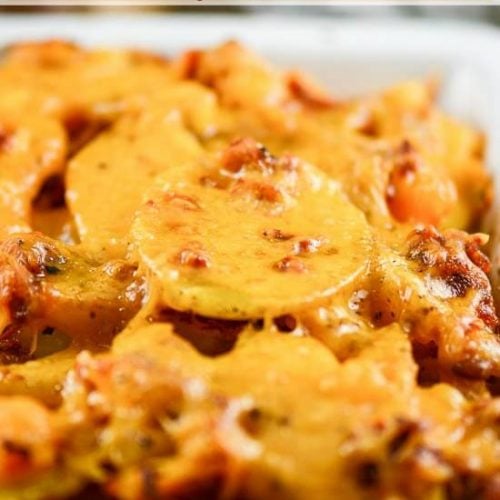 Sun Dried Tomato Pesto Cheesy Potatoes will make you a hero at your family get togethers. Cheddar cheese, sun dried tomato pesto, and scalloped potatoes combine for an easy, rich, creamy and cheesy side dish recipe.
