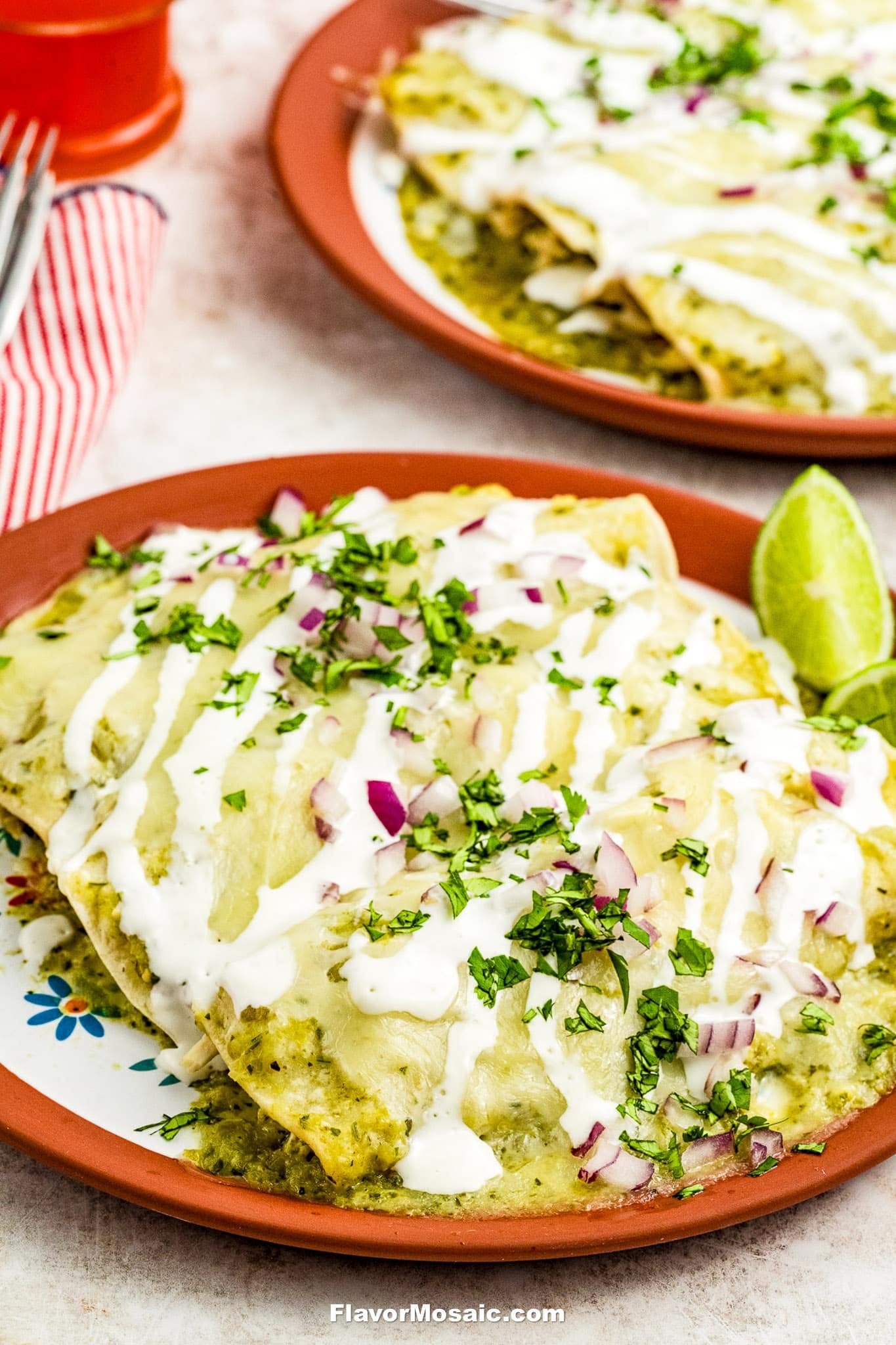 Unlike many recipes online, this version keeps the sauce light and tangy instead of creamy. This chicken enchilada verde recipe is finished with Monterrey Jack Cheese, a drizzle of Mexican crema, and garnished with chopped fresh cilantro, and red onions for a beautiful restaurant style presentation.