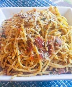 Dress up plain pasta with sun-dried tomato pesto, crisp bacon, parmesan cheese, a dusting of black pepper, and fresh parsley.